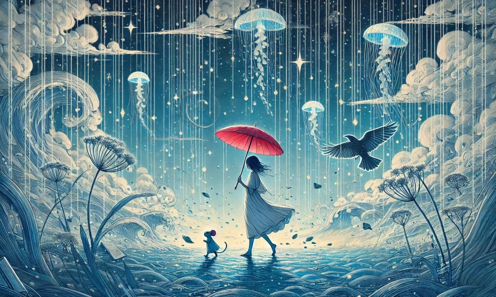 在終年細雨的城市裡,女孩撐著小紅傘,日復一日在街角賣花。她深信,心中的愛與星光將指引她找到失散的家人。然而,前方的路途遙遠且未知。直到一場夢境,她遇見了發光的水母與低吟的鯨魚,這些奇妙的際遇為她點亮了勇氣與希望。她的旅程,才正要開始……